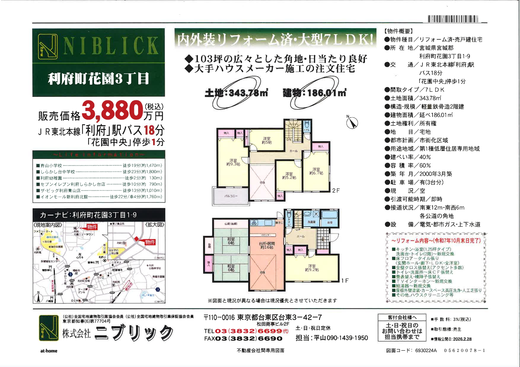 利府町花園3丁目 リフォーム済み再生住宅 大手ハウスメーカー施工の注文住宅 軽量鉄骨造2階建て 大型7LDK 駐車スペース3台分 南東・南西角地