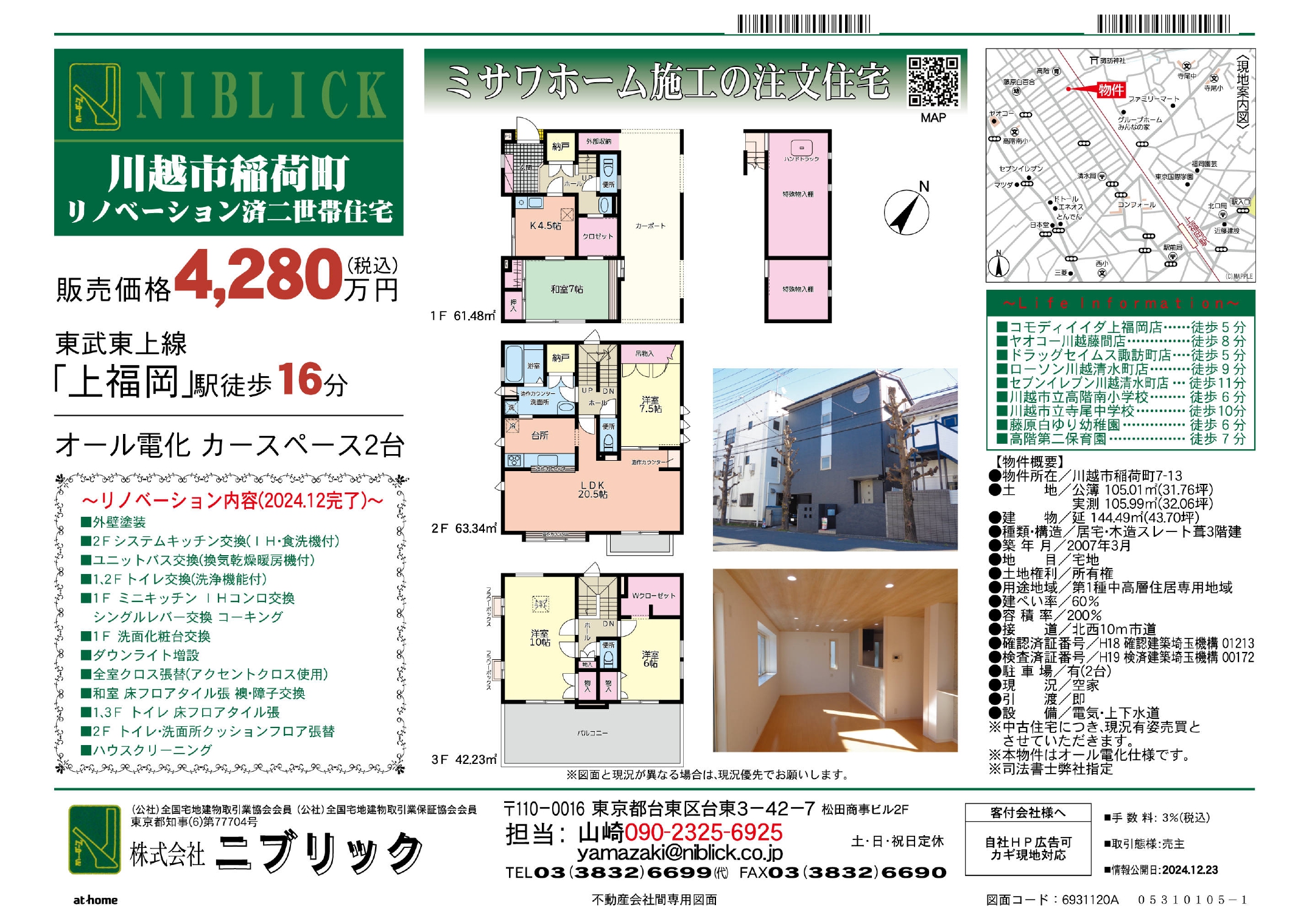 川越市稲荷町 リフォーム済み再生住宅 ミサワホーム施工注文住宅 2世帯住宅仕様 大型ルーフバルコニー カースペース2台 オール電化